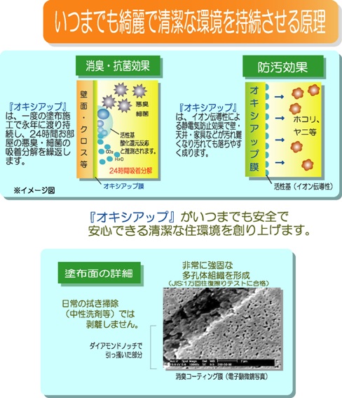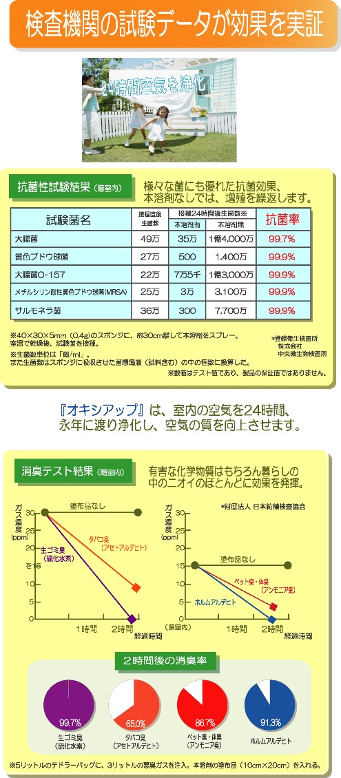 | 平成15年7月に建築基準法が改正され建築物に使用される建材や換気設備を規制されましたが、シックハウス症候群の患者は増加する一方です。化学物質の発生源には建材・家具・じゅうたん・シロアリ駆除剤と様々な物が考えられます。全国でシックハウス症候群でお悩みのたくさんの方々(特に小さなお子様、高齢者の方)に無光触媒オキシアップの効果を実感して頂たいと思いました。それには、当社だけでは大変な時間と人手が必要に成ります。そこでビジネスパートナーを募集し、少しでも早くシックハウス症候群でお困りの方々に喜んで頂きたいと考えています。 |